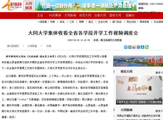 黃河新聞網大同訊(記者趙穎 通訊員王麗芹)4月28日,大同大學疫情防控工作領導小組集體收看山西省教育廳組織開展的全省各學段開學工作視頻調度會,并結合大同大學實際情況,對下一步全面開學復課工作進行專題研究。大同大學黨委書記弓永華主持會議。