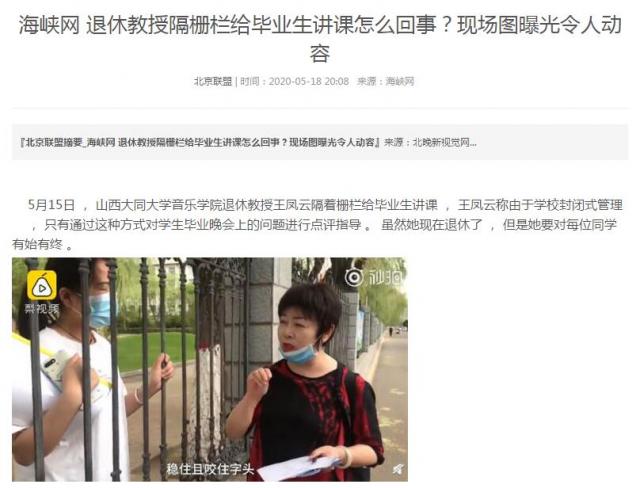 5月15日 , 山西大同大學音樂學院退休教授王鳳云隔著柵欄給畢業生講課 , 王鳳云稱由于學校封閉式管理 , 只有通過這種方式對學生畢業晚會上的問題進行點評指導 。 雖然她現在退休了 , 但是她要對每位同學有始有終。
